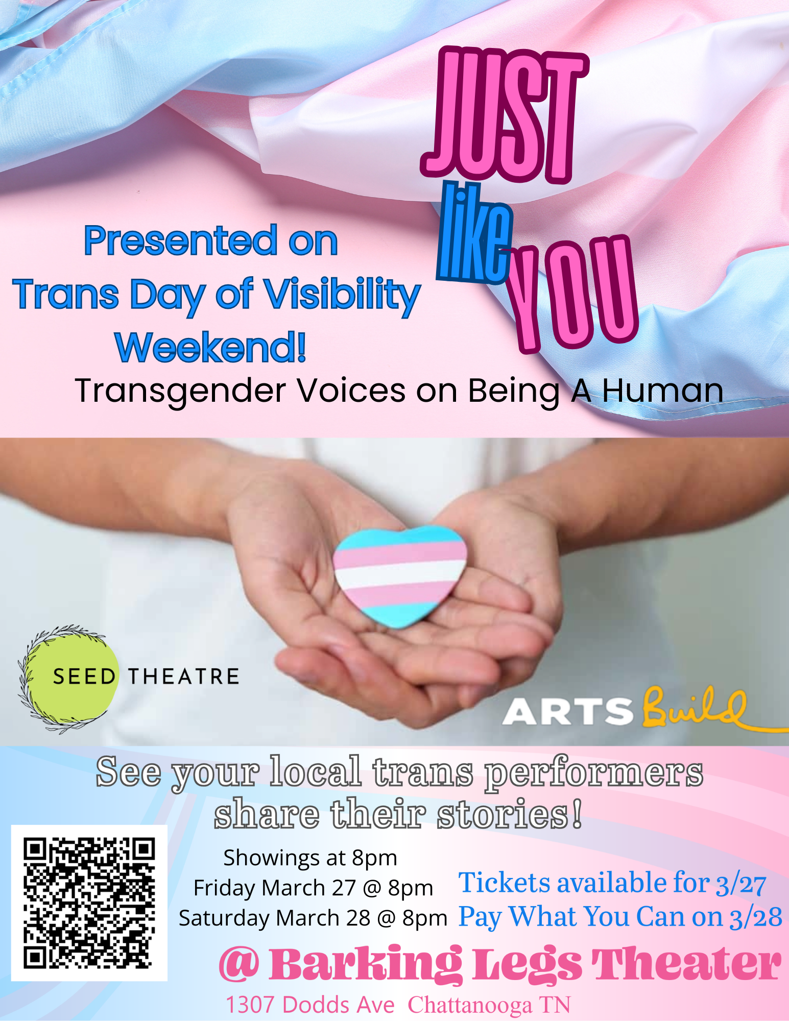 Seed Theatre presents Just Like You: Trans Voices on Being Human; a powerful evening of storytelling that brings transgender voices to the stage in an honest, intimate, and deeply human performance. Developed in collaboration with transgender artists from Hamilton County and surrounding communities, this live performance features personal monologues that explore the everyday realities of life—family, work, relationships, humor, joy, struggle, and resilience. Rather than telling stories about transgender people, Just Like You creates space for trans individuals to tell their own stories directly to the audience. Through these authentic voices, the performance invites audiences to connect with experiences that are deeply personal yet universally human.