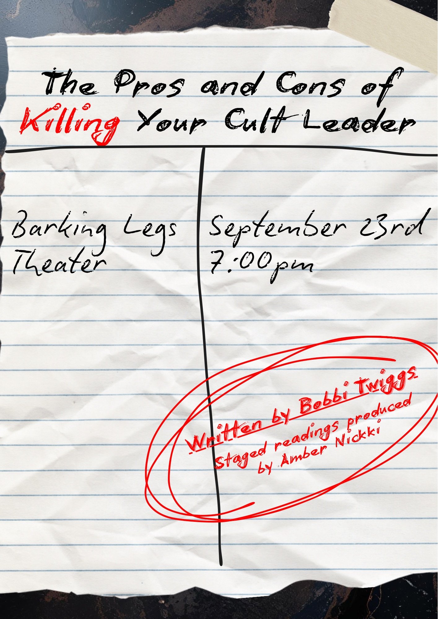 The Pros and Cons of Killing Your Cult Leader, written by Bobbi Twiggs, explores the complexities of leaving a cult through a comedic lens. The play follows five women in The One True Way Intentional Living Community as they grapple with the idea of killing their leader. The play uses physical humor and satire to explore difficult themes of cult religious oppression and trauma on women.